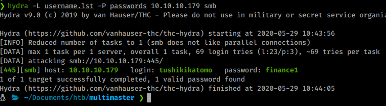 hydra -L username.lst -P passwords 10.10.10.179 smb