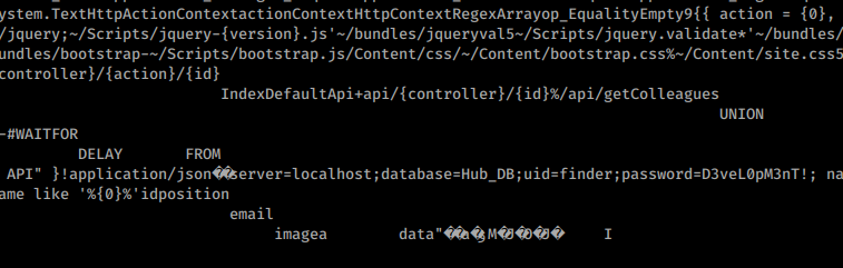 There is a password string - D3veL0pM3nT! Normally, I would open this file with dotPeek but this time cat got the job done! For those interested, here is it’s location within the DLL.