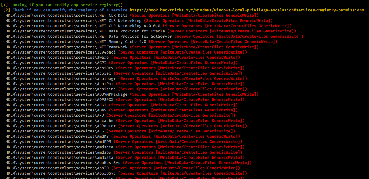 Still no access to our root flag yet! We need to continue to enumerate. This time winPEAS does give us what we want right away! We see that we have the ability to modify registry entries of services. Sow e can simply modify a services registry entry so that it will send a connection back to use as System!