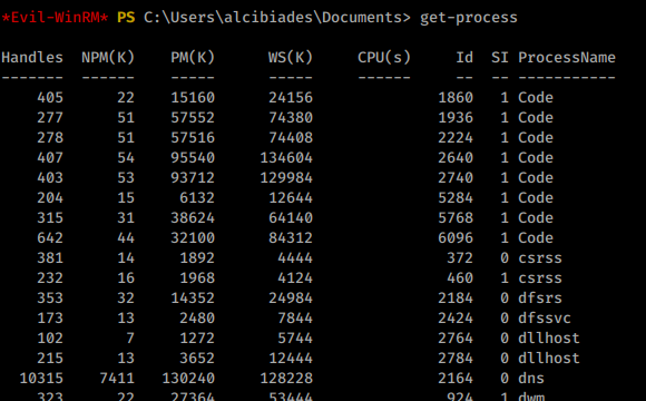It would seem like this could be our path forward but how. We’ll need to enumerate further. Our winPEAS results weren’t that great but that can often be the case when permissions are lacking. I generally do a second round of enumeration on every box by hand for missing links. In this case, we will issue the PowerShell command get-process to see what’s running on the current system.
