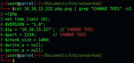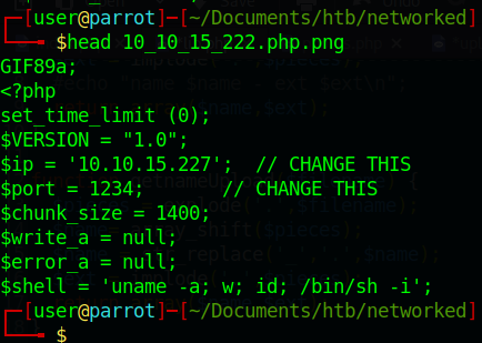So our goal here is to simply upload a reverse shell and have it execute. The first thing we’ll do is copy our standard reverse php shell file into our working directory. We’ll then make a copy under the name 10_10_15_222.php.png since we know that the page with audit the filename and type. Now we’ll modify the script accordingly.