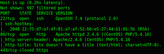 You guessed it, we are starting it off with our standard nmap scan: nmap -sC -sV -oA networked 10.10.10.146. Our results come back pretty basic. A denied port 443, ssh and http.