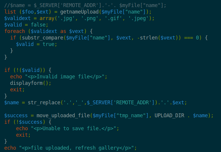 Now all we have to do is check the source of these pages to see what is happening. Essentially upload.php is only letting us upload images types, change the underscores for periods and setting permissions.