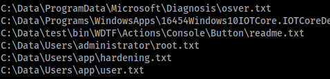 Running this files doesn’t really help us much though. It’s missing some components that are not included in the IoT Windows 10 version. Looks like we’ll enumerate by hand. The first thing I did was search for .bat and .txt files.