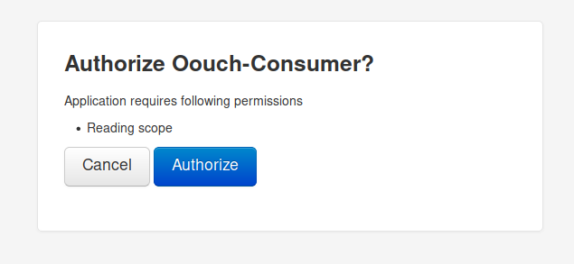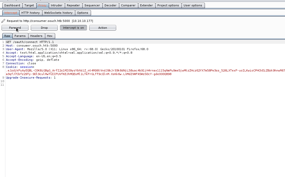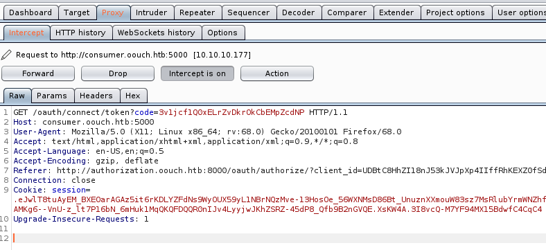 We’ll create an account on authorization.oouch.htb:8000. Once we do that we’ll navigate back to http://consumer.oouch.htb:5000/oauth/connect and turn on our Burpsuite intercept. We then login with our standard account previously created and forward the first 3 requests. We eventually should be prompted with an option to authorize: