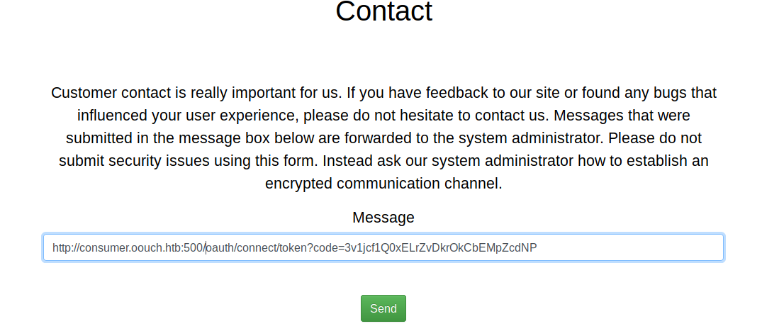 We then send the ‘message’. We can now head over to http://consumer.oouch.htb:5000/oauth/login. This should give au another Authorization link, this time we will authorize it. If all goes well, we should now be the admin on the machine!