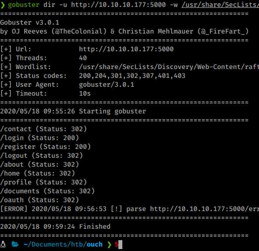 The options here are pretty basic. While we manually poke around the page, we’ll start up a gobuster to start enumerating what might be here. The standard set of lists did not turn up anything. Using some of the other discovery lists in SecLists - Raft-large-directories shows us there is an oauth location. That could be of use.