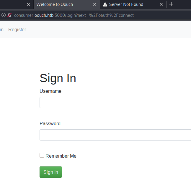 It tells us to visit consumer.oouch.htb to connect, so we’ll add these two hostnames to our hosts files and try to authenticate. Once we do that we are able to sign in again to verify our credentials.