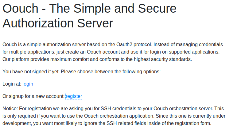 Given these notes we know there is an api that has users and user data. We can alsu use that set of credentials to register applications. So if applications are allowed, where do they go? My first guess would be /applications. Turns out it is that but under the authorize.oouch.htb:8000/oath location. 20-20 hindsight, recursive dirbuster would have worked more effectivly… When we attempt to reach this page, we are greated with a password prompt. We’ll use the supplied credentails to acces it. We keep getting denied. We’ll lauch another gobuster against this url and see what we might find. Eventually we find /oauth/applications/register. We are then given some options to register our application: