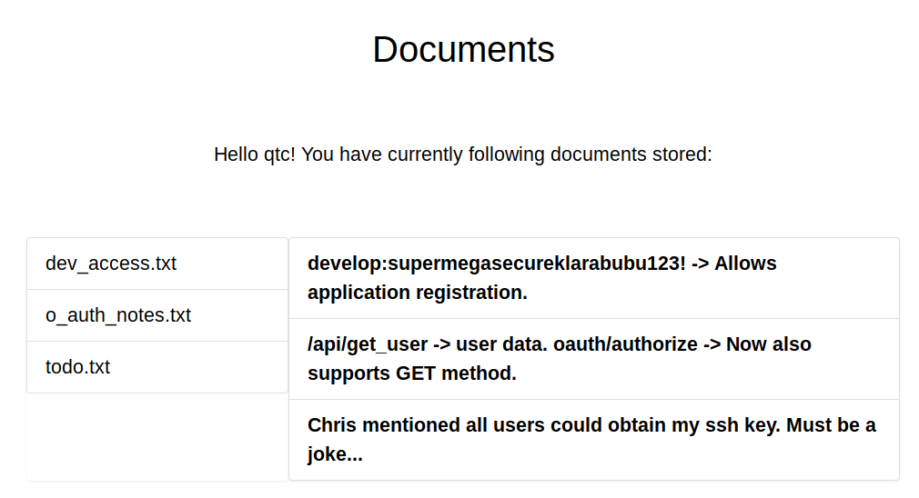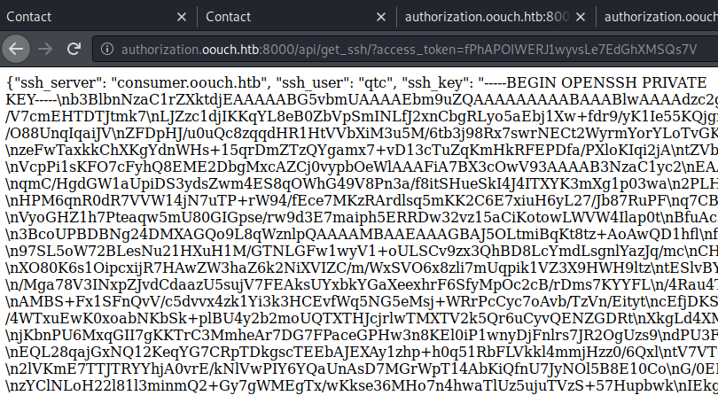 Once it finishes we see there is indeed 3 variables we can use. The one that’s really of interest is ssh. So we go over to the /get_ssh location with our authorization token and…