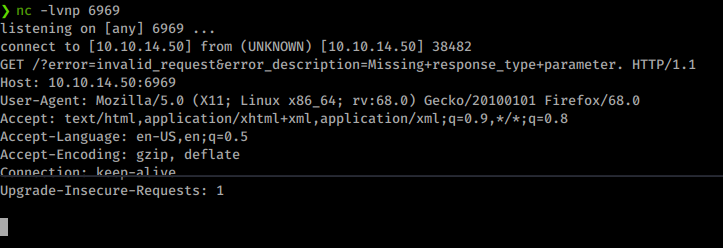 When I try to access this it seemingly hangs. Now if I load up a netcat listener on my redirect_uri port, I get an HTTP request: