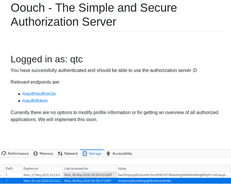Eventually we get back a sesionid cookie. We can now edit our local cookies an apply this one. We head over to authorization.oouch.htb:8000 and see we are logged in as our test account. We open up our dev tools. Go to Storage. Then modify our sessionid value with our new one and boom, we get qtc’s access.
