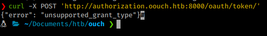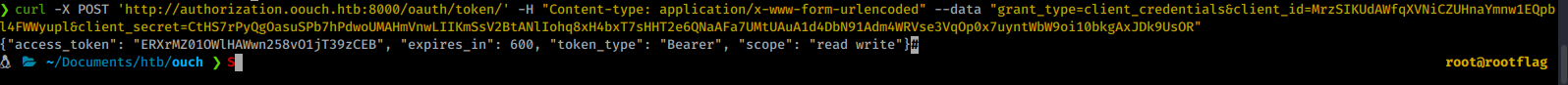 curl -X POST 'http://authorization.oouch.htb:8000/oauth/token/' -H "Content-type: application/x-www-form-urlencoded" --data "grant_type=client_credentials&client_id=MrzSIKUdAWfqXVNiCZUHnaYmnw1EQpbl4FWWyupl&client_secret=CtHS7rPyQgOasuSPb7hPdwoUMAHmVnwLIIKmSsV2BtANlIohq8xH4bxT7sHHT2e6QNaAFa7UMtUAuA1d4DbN91Adm4WRVse3VqOp0x7uyntWbW9oi10bkgAxJDk9UsOR"