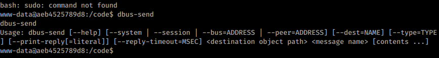 When we cat the .bash_history we some commands being run from inside /code. We’ll navigate there and see what might be of use. Reading through and analyzing the code we see an interesting import call: import dbus. This could be of use to use to create a payload and send it to our machine. Since the file is owned by root, we could have root access. No dice. It would seem root owning the file is the blockage here.