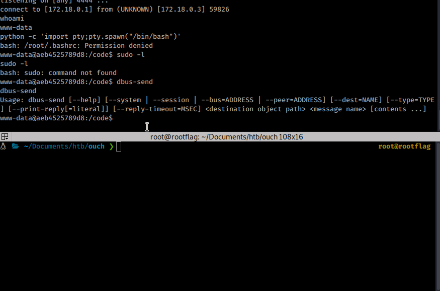 Once we run it, we see a shell come back on our netcat listener as www-data. We then upgrade our shell session. In this case we want to re-attempt our dbus exploit from earlier since www-data might have rights to this service.