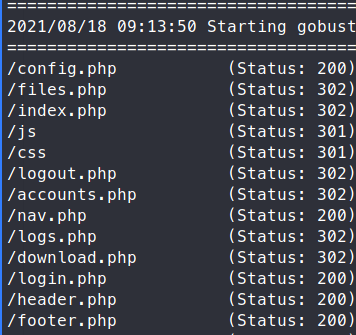 We see that a basic username / password landing page. Before we start digging into the web requests, we’ll try to enumerate any additional files or directories with gobuster.