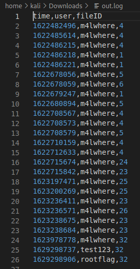We still need a username to go with the password. Now, if we look around the site a bit more we have a Request Log Data section. If we download the file, we can see the users associated to logging in, this could give us a user to SSH with.