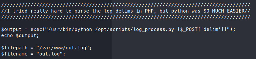 Unable to login with those credentials. Now as we continue to sift through the files, we find a gem. A Python exec() call in the logs.php file.