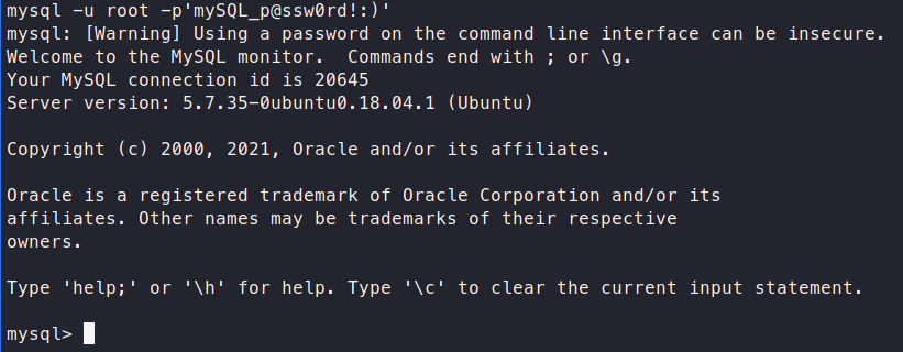 mysql -u root -p'mySQL_p@ssw0rd!:)'