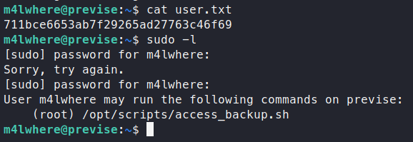 Sure enough, we are in! Let’s snag our user.txt flag and find a way to root! The next thing we check is sudo -l.
