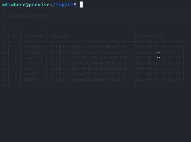 Now we see our username and hashes. We’ll copy them out to crack, we really just want m4lwhere in particular.