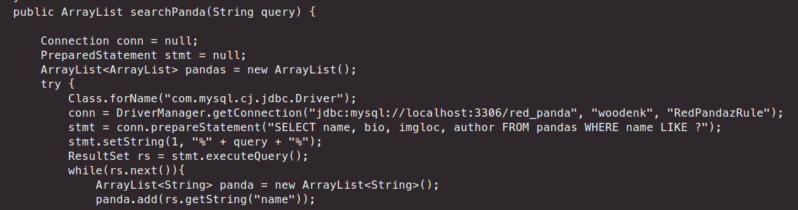 We look a the source of the cleanup.sh script and it’s doing nothing but removing files. But it does lead me to down a path to /src/main/java/com/panda_search/htb/panda_search. Here there are a few files that are very useful. We can see how the search function works and why certain characters aren’t allowed - but more importantly, we have hardcoded credentials.