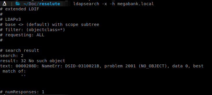 We can start by checking to see if we can enumerate LDAP anonymously. To do that we issue: ldapsearch -x -h megabank.local