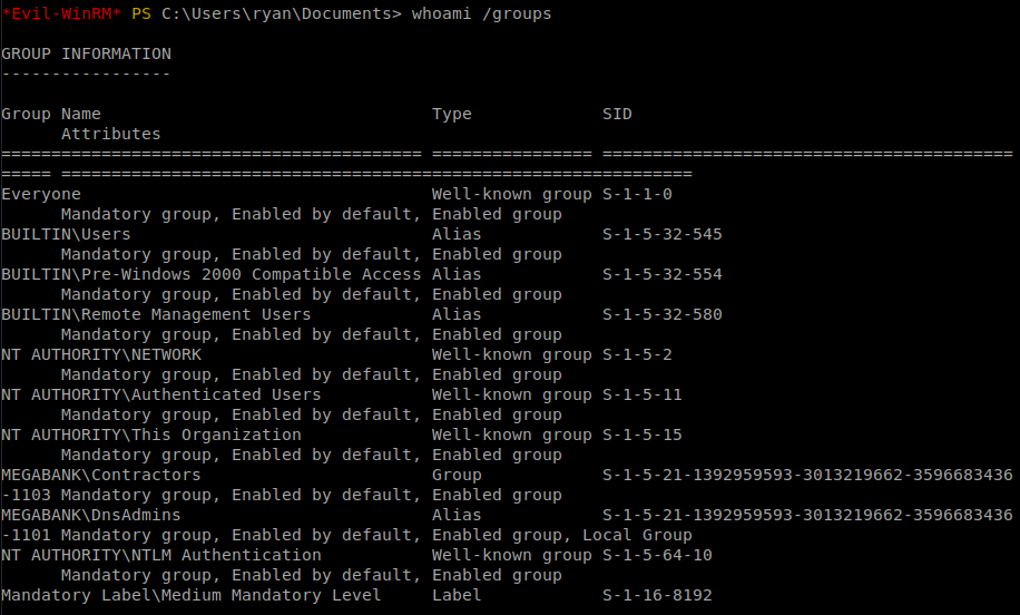 We can now login as Ryan. We do some more enumeration and see that Ryan is part of the DNSAdmins group.