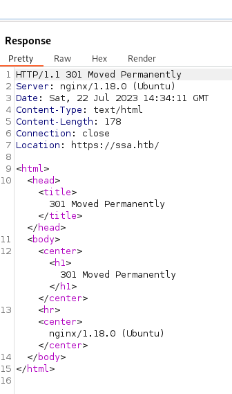 This is fun, we have a port 80 and a port 443 showing on the server. It also shows that our port 80 request was redirected to 443. Let’s see what’s being hosted on the ports. Right off the bat, when we try to browse to port 80 we get Burpsuite telling us that it cannot resolve ssa.htb. The request also shows a 301 error with a redirect.