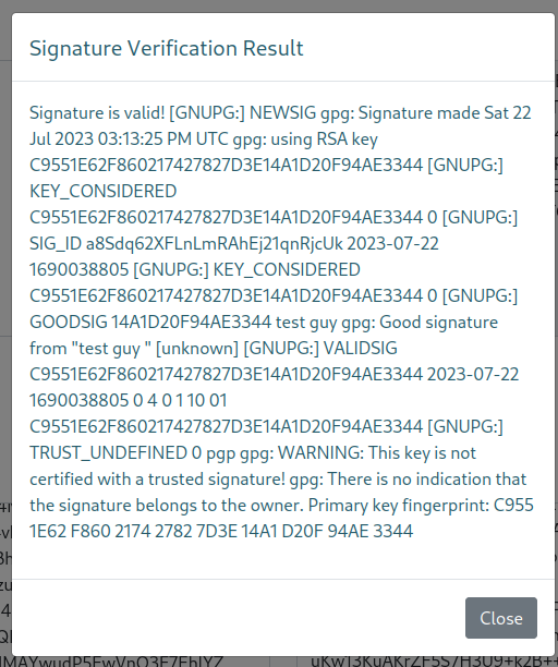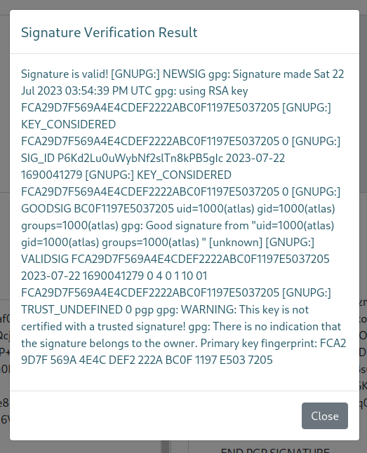 So we’ll add ssa.htb to our hostfile and reload the page. Once we do that we are reloaded to the Secret Spy Agency page. Browsing around the site we see that it’s built on Flask. We also see there’s a place for us to supply an encrypted message. There is also a documentation / guide page listed below that on how to use PGP Encryption. We also see a user listed here too - Atlas@ssa.htb. After some tinkering, we see that the verify function seems to simply split out a console output.