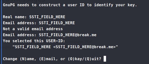 Now, we can cat the signed_msg.asc. This is the content we paste into the verification function on ssa.htb. So it did verify the message but did not result in an SSTI. However, this is not the only field we can test against.