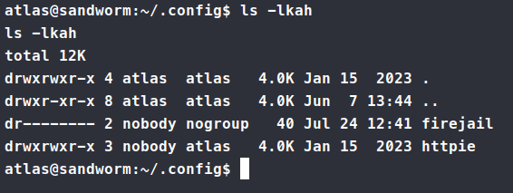 We have a shell! However, we don’t have the flag yet. We need to look for a way to jump out of the Atlas user into silentobserver. As we look around and try things as the user, we don’t have access to some normal commands like wget, curl, sudo and others. So we’re manually enumerating for now. Looking around in the home directory for the user we see a .config directory.