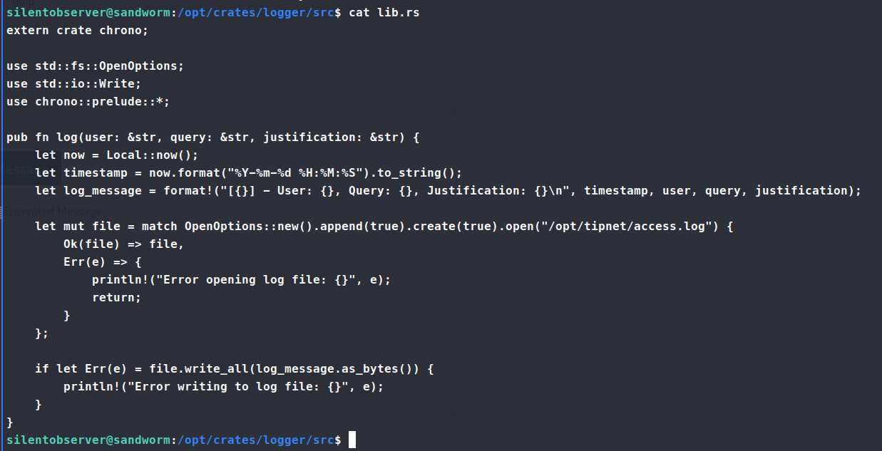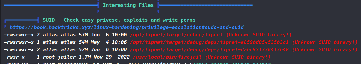 . Now this exploit needs to be run as Atlas and not silentobserver. So we copy this the file over to /tmp/exploit.py and run it as Atlas. Turns out Atlas cannot read anything in that location. After trying a few methods, we aren’t able to get Atlas to read the file in any location via the webshell we obtained. Back to the drawing board. As we resift back through the linpeas data, we see the other application with the SUID bit set - tipnet. Digging into this file and location, we see that the tipnet.d file has lib.rs and main.rs listed. We cross reference the files against our linpeas data and see that lib.rs is a group writable file.