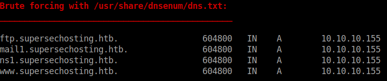 The gobuster results come back fairly standard. We will probably need to enumerate vhosts on this system further down the line. After this I did a quick dnsenum against the server to see what might be there: dnsenum --dnsserver 10.10.10.155 supersechosting.htb For now we’ll browse to the web service running and see what’s there.