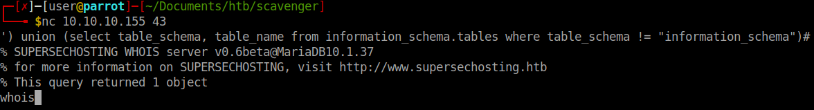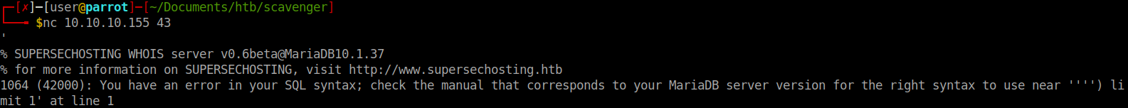 Well, we have a mail server name as well. We’ve done some basic enumeration around port 53 as well as 80. We should look to enumerate port 43, which is whois. We can interact with the port via nc. From our previous enumeration we know that it has a linked MariaDB associated to it. It’s possible that we can use SQL commands direct to the port and have them queued for processing.
