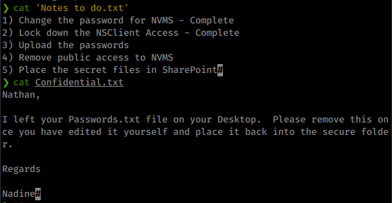 We see that there is something hosted on port 80 as well as anonymous login enabled for our FTP service. So we’ll log into the FTP and see what’s inside the Users folder we’re show in our scan. Once logged in we start pathing through the directory. We get two user names Nathan and Nadine. Inside each of their directories are two files, so we download them to see what might be inside.